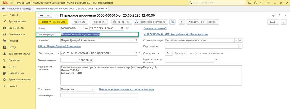 Рис. 7. Платежное поручение на возмещение расходов волонтеру