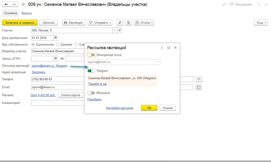 Настроить способ отправки можно в разделе Расчеты в карточке владельцев участка/гаража.