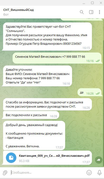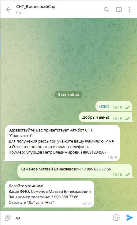Для подключения к рассылке через Telegram владелец участка/гаража должен отправить любое сообщение в чат-бот. После отправки сообщения садовод или владелец гаража получит сообщение от бота с предложением указать свои ФИО и номер телефона. Получив контактные данные, бот потребует их подтверждения.