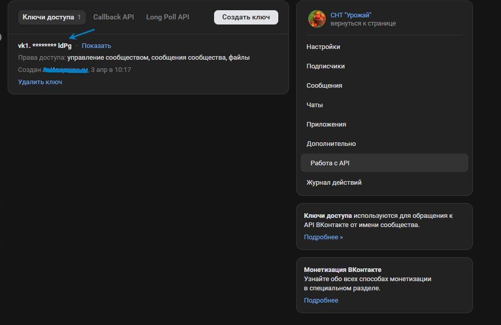В этом же разделе Работа с API скопируйте ключ доступа и ключ группы для ввода этих данных в программе.