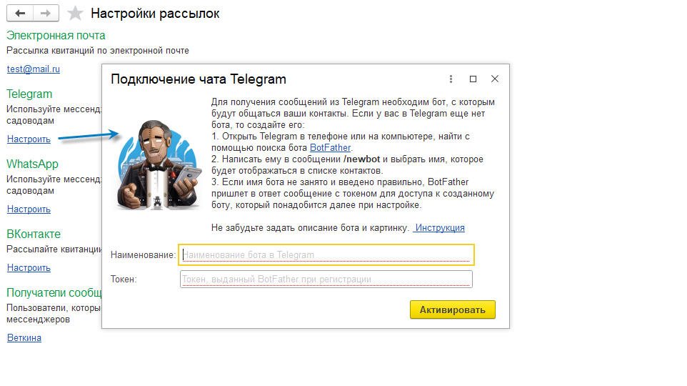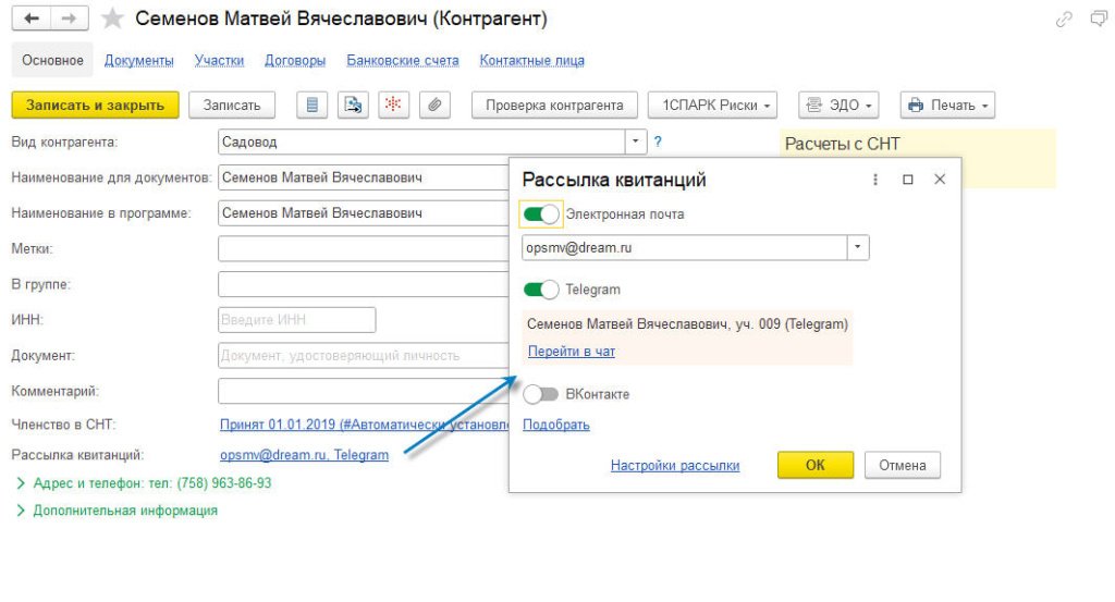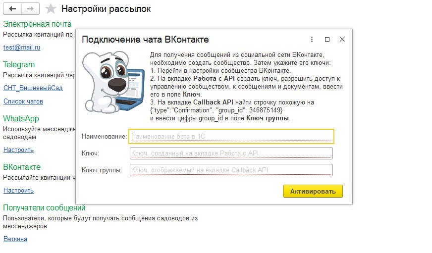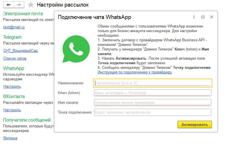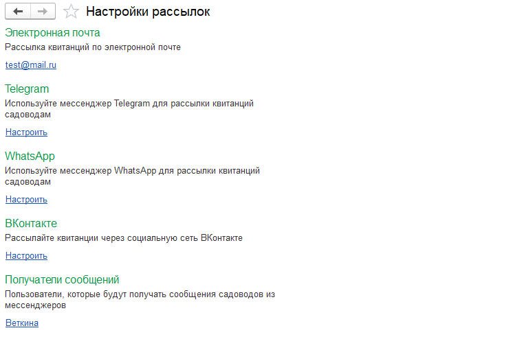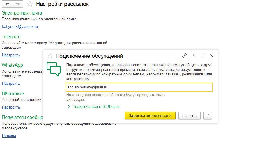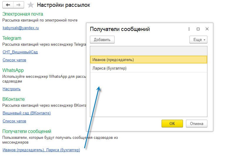 Подключение к мессенджерам в программах «1С:Садовод» и «1С:Гаражи»