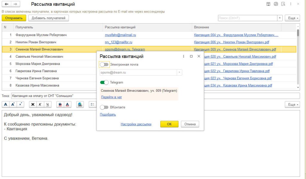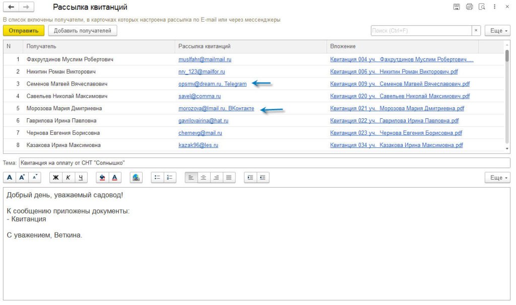 Аналогично квитанциям в программах «1С:Садовод» и «1С:Гаражи» через мессенджеры можно рассылать карточки расчетов. Для отправки карточек используйте команду Отправить.