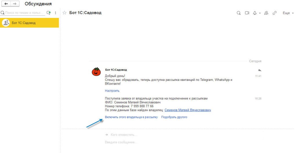 О новом функционале программы «1С:Садовод» и «1С:Гаражи» извещают пользователей с помощью баннера. Если в программе подключены Обсуждения, то вместо баннера будет показано сообщение от бота программы.