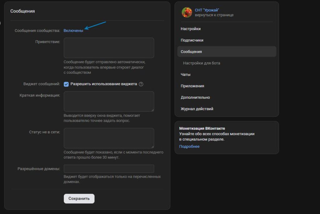 Для подключения ВКонтакте необходимо сначала создать Сообщество. После создания сообщества перейдите в раздел Управление. В разделе Управление откройте пункт Сообщения. Убедитесь, что пункт Сообщения сообщества имеет значение Включены.