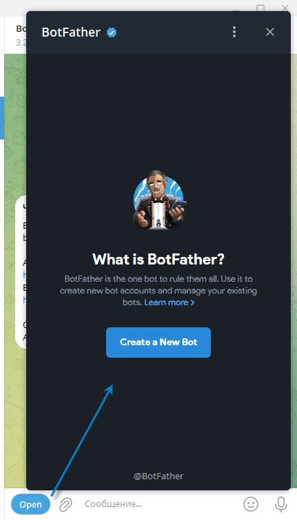 Перейдите в специальный инструмент Telegram для создания ботов BotFather. Ссылка есть на форме подключения.