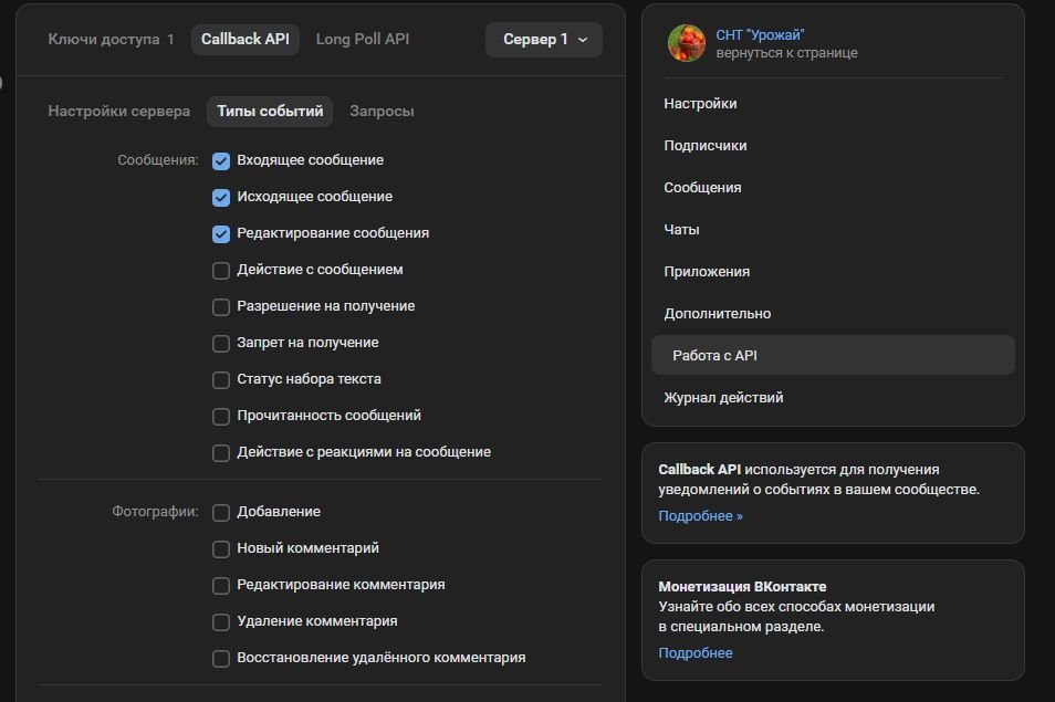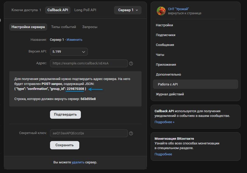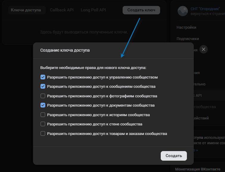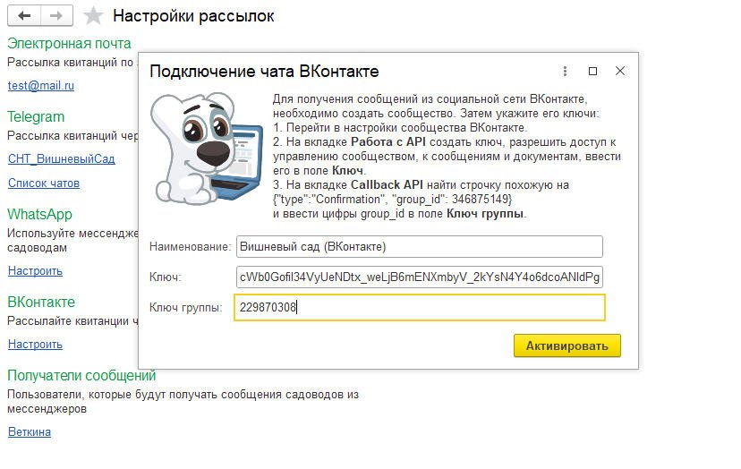 Пригласите владельцев участков/гаражей в созданное вами сообщество. Через чаты ВКонтакте они смогут получать квитанции и карточки расчетов. Придумайте название для настройки с ВКонтакте и введите ключ доступа и ключ группы, которые вы ранее скопировали. Настройка завершена!