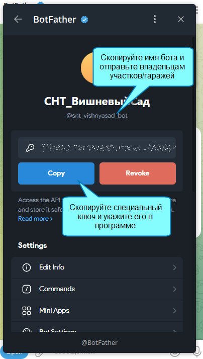 После создания бота (см. рис. ниже) скопируйте имя бота, отправьте его владельцам участков в программе «1С:Садовод» (или владельцам гаражей для программы «1С:Гаражи»). Они должны ввести имя бота в поиск Telegram и перейти в него.