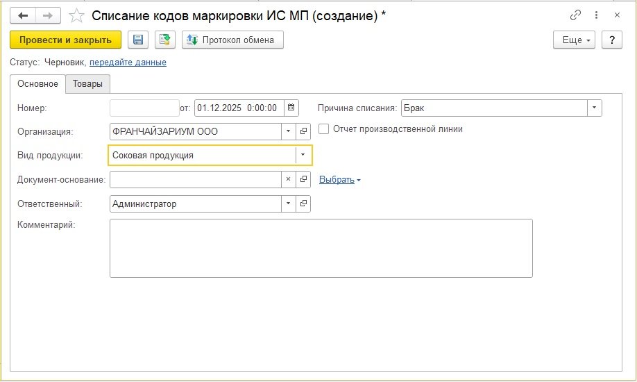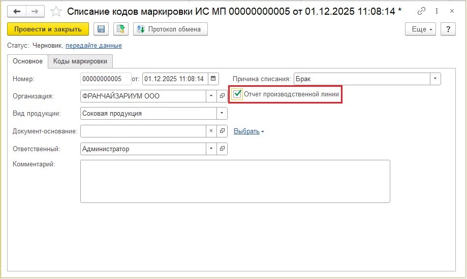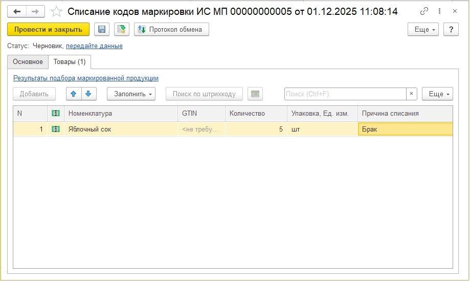 Рис. 1. Документ «Списание кодов маркировки ИС МП»
