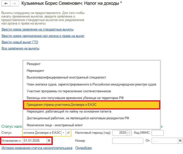С 1 января 2026 года статус налогоплательщика Гражданин страны-участника Договора о ЕАЭС можно использовать для всех граждан ЕАЭС вне зависимости от налогового резидентства. При этом гражданам ЕАЭС не предоставляются налоговые вычеты до получения ими статуса налогового резидента РФ.