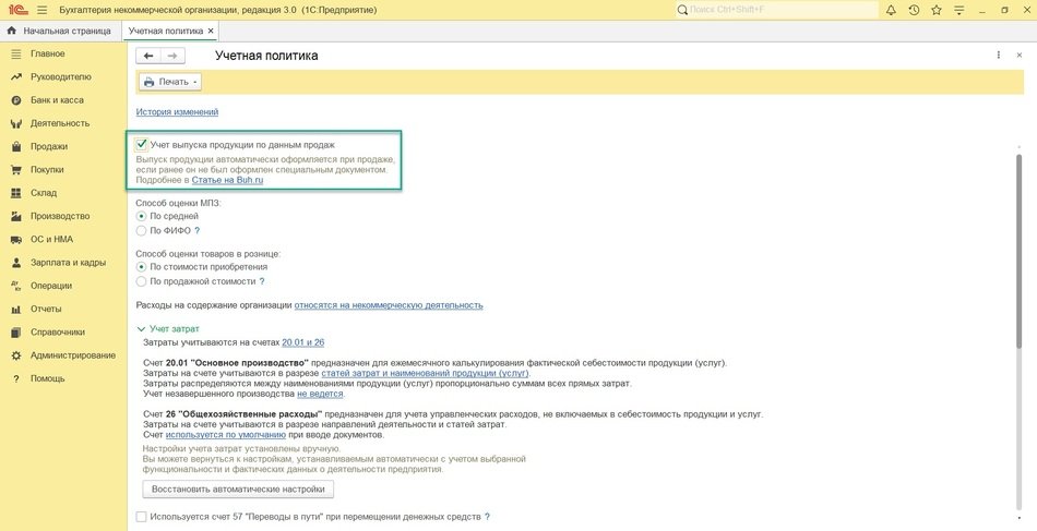 - Автоматический выпуск продукции по данным продаж (подходит для самых простых случаев, когда себестоимость готовой продукции не требует детального расчета, у организации нет складских запасов, а все, что выпущено, сразу же реализуется).
