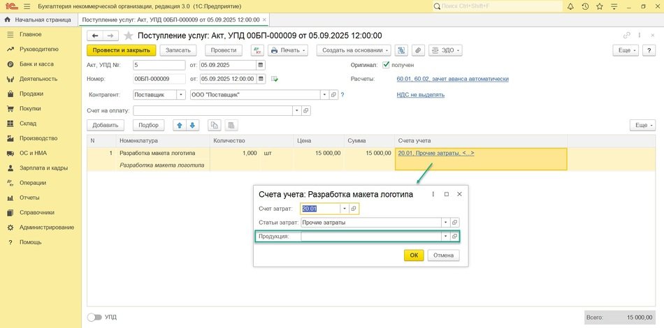 Услуги по разработке макета логотипа можно отразить документом Поступление услуг: Акт, УПД с указанием соответствующей аналитики затрат по услугам: раздел Покупки − Поступления (акты, накладные), рис. 5.