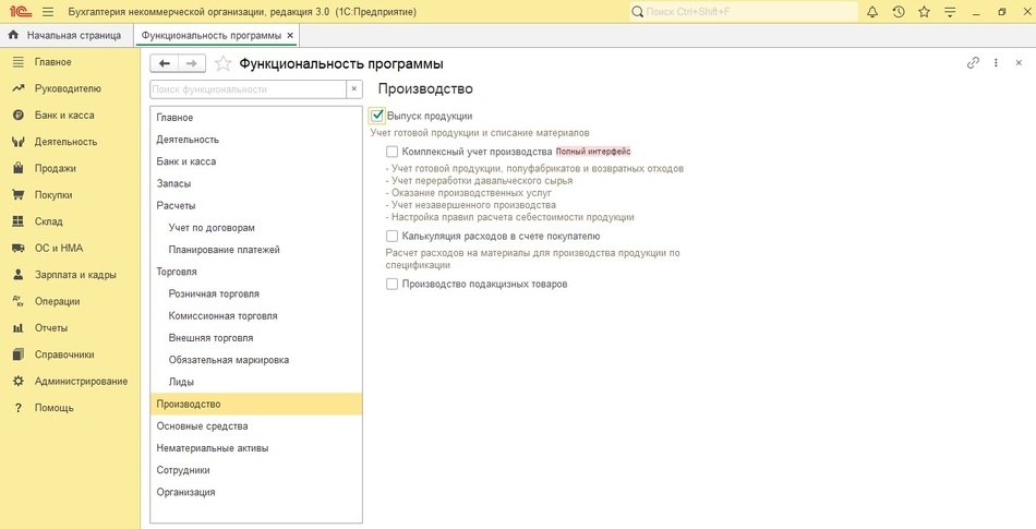 Рис. 1. Включение функциональности производства в программе