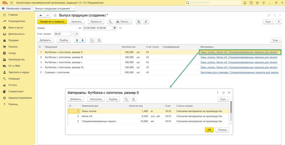 Если в некоммерческой организации производственная деятельность носит разовый характер, то нормы расхода материалов можно не задавать. Указать состав и количество материалов в этом случае можно будет непосредственно в документе Выпуск продукции (раздел Производство – Выпуск продукции).