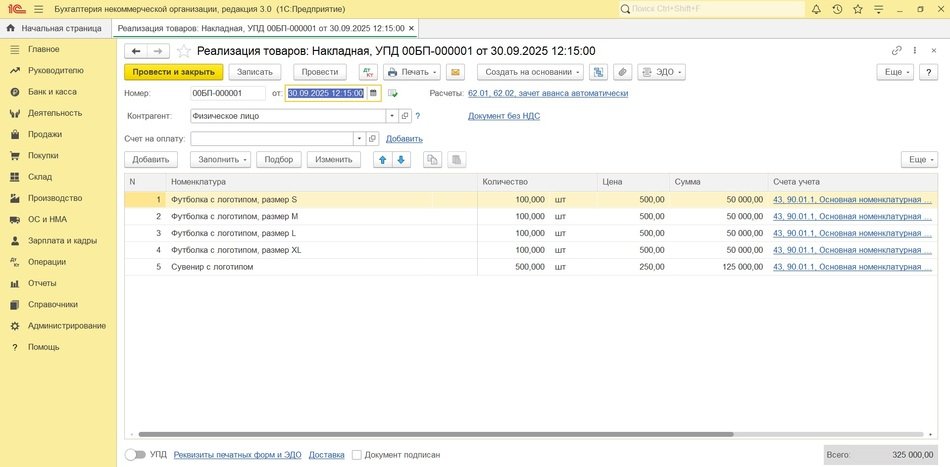 Реализация продукции участникам мероприятия оформляется с помощью документа Реализация (акт, накладная, УПД) с видом операции Товары (накладная, УПД) (раздел Продажи – подраздел Продажи).