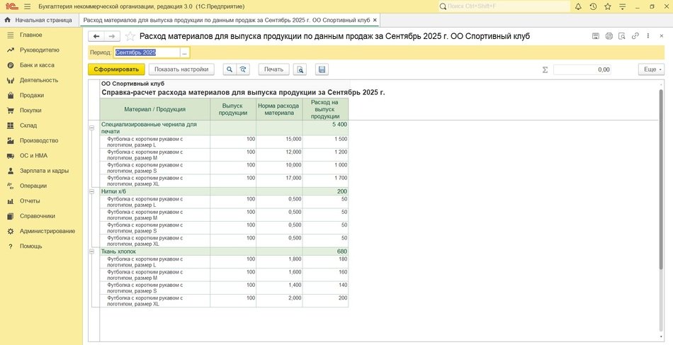 Рис. 4. Справка-расчет «Расход материалов для выпуска продукции по данным продаж»