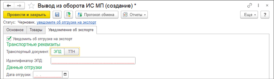 Формирование уведомления в 1С и отправка в ГИС МТ