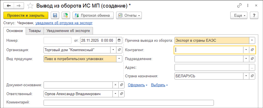 В программе «1С:Управление торговлей 8» (ред. 11.5) уведомление оформляется из документа Ввод из оборота ИС МП с указанием операций Экспорт в страны ЕАЭС, Экспорт за пределы стран ЕАЭС (рис. 1).