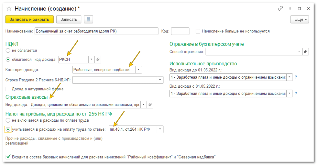 В справочнике Начисления (раздел Зарплата и кадры – Справочники и настройки – Настройки зарплаты – Расчет зарплаты) нужно создать новый вид расчета с кодом дохода по НДФЛ РКСН, категорией дохода Районные, северные надбавки, видом дохода по страховым взносам Доходы, целиком не облагаемые страховыми взносами, кроме пособий за счет ФСС и денежного довольствия военнослужащих и настройкой учета в расходах на оплату труда по статье пп.48 ст.264 НК РФ (рис. 1).