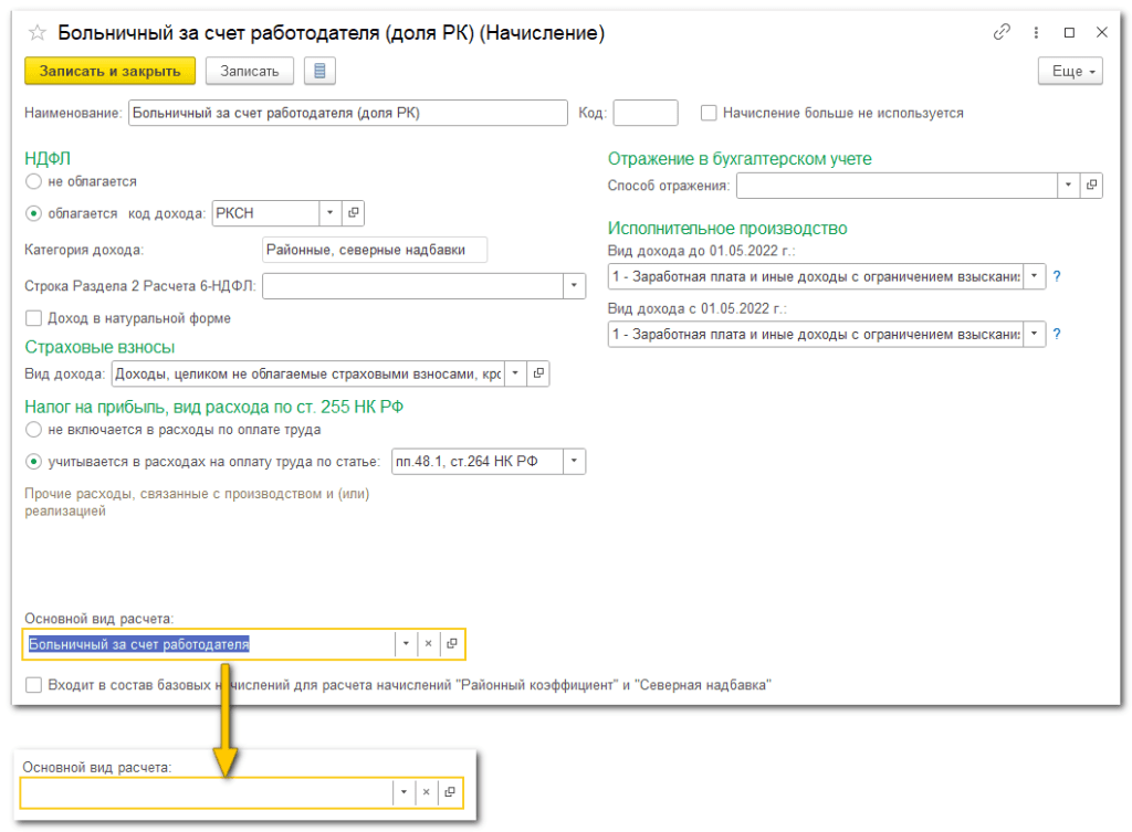Если в программе «1С:Бухгалтерия 8» ред. 3 в списке начислений уже были созданы «долевые» начисления (например, для вида расчета Больничный за счет работодателя предусмотрено долевое начисление, в котором есть поле Основной вид расчета и выбрано значение Больничный за счет работодателя), то после обновления на новую версию после 3.0.194.14 и выше в документе Больничный лист (раздел Зарплата и кадры – Все начисления) автоматически начнут выделяться доли РК и СН при расчете больничного.