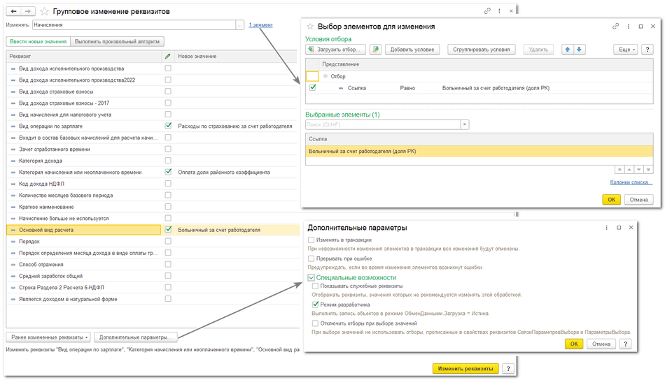 В нижней части формы нужно нажать на кнопку Дополнительные параметры и установить флаг Режим разработчика. После сохранения параметров в окне обработки в поле Изменять следует выбрать начисления. При этом в форме выбора элементов для изменения строго необходимо добавить отбор по ранее созданному виду расчета Больничный за счет работодателя (доля РК) из пункта 1 выше.