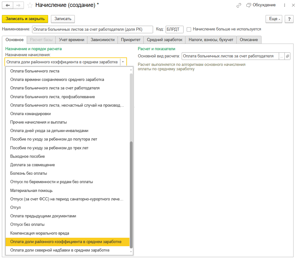 Настройка новых начислений для расчета больничного в 1С