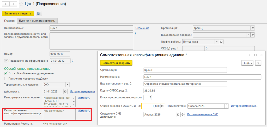 Для корректного исчисления взносов на травматизм по обособленному подразделению, выделенному в качестве СКЕ, в программе «1С:Зарплата и управление персоналом 8» ред. 3 нужно настроить организацию и подразделение (раздел Настройка – Предприятие).