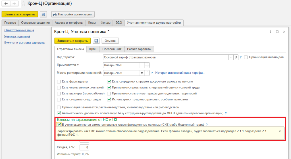 ❗ При установке надбавки или скидки (в %) к тарифу страховых взносов на травматизм для организации в целом в карточке обособленного подразделения, зарегистрированного в качестве СКЕ, необходимо указывать действующую ставку взносов в СФР на НС и ПЗ по присвоенному классу опасности для СКЕ без учета надбавки или скидки.