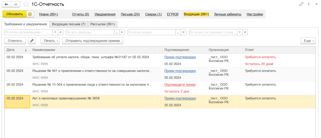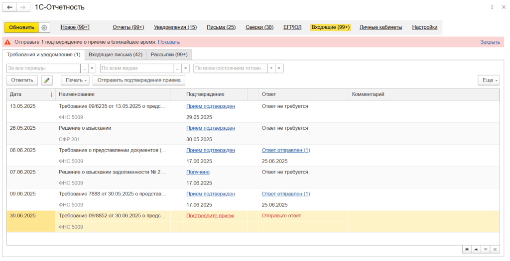 Поступающие в 1С-Отчетность требования и запросы ИФНС и СФР хранятся в разделе Входящие на вкладке Требования и уведомления.