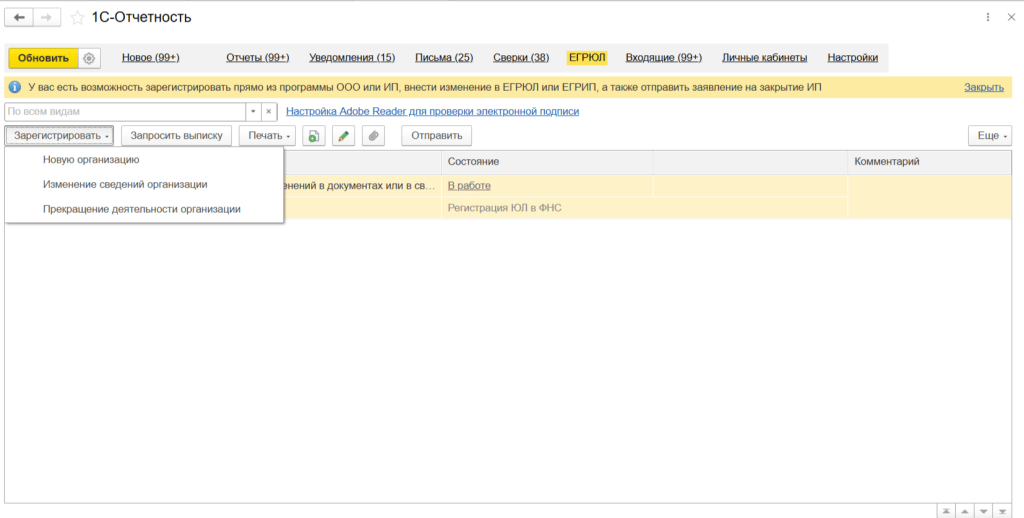 При помощи сервиса 1С-Отчетность пользователи могут зарегистрировать новую организацию, ИП, прекратить их деятельность, а также внести изменения в ЕГРЮЛ или ЕГРИП. Для совершения регистрационных действий служит закладка ЕГРЮЛ. В ней необходимо нажать команду Зарегистрировать и выбрать необходимое действие, например, Изменение сведений организации.