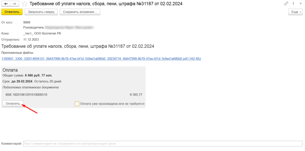 Все документы, требующие оплаты, поступают в раздел Входящие. Для отслеживания этих документов нужно пройти на закладку Требования и уведомления. Соответствующим документам здесь присвоен статус Требуется оплатить. В окне документа, требующего оплаты, можно узнать сумму к уплате, срок уплаты и основание, по которому компании была начислена данная сумма.