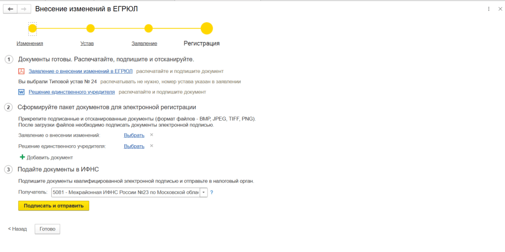 Далее для пользователей «1С:Бухгалтерии 8» откроется пошаговый помощник для внесения изменений в сведения организации. После заполнения всех данных и прикрепления необходимых документов нужно нажать на кнопку Подписать и отправить.