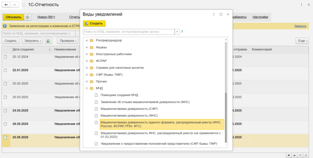 Помимо перечисленных действий, сервис 1С-Отчетность позволяет оформлять, регистрировать и работать с машиночитаемыми доверенностями (МЧД). В сервисе можно создать МЧД версии 003, которая используется для представления обязательных сведений в ФНС, ФТС, Росстат, Росалкогольтабакконтроль и Росприроднадзор.
