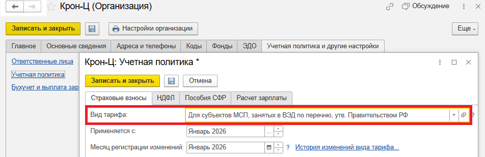 оперативно вносить изменения в основные сведения организации (раздел Настройка – Предприятие – Организация) и вид тарифа страховых взносов (раздел Настройка – Организации – Учетная политика и другие настройки – Учетная политика);
