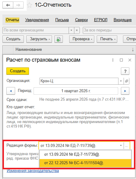 Для отчета за I квартал 2026 года в программе доступна к выбору действующая и рекомендованная редакции формы.