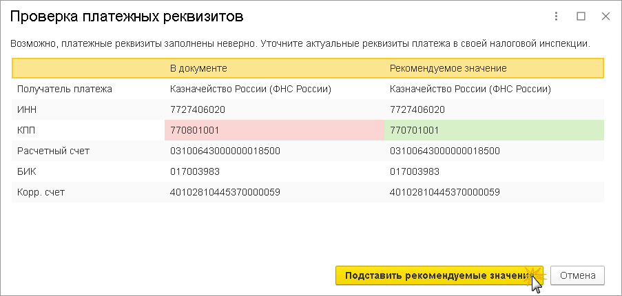 В открывшейся форме Проверка платежных реквизитов следует нажать на кнопку Подставить рекомендуемые значения (рис. 2).