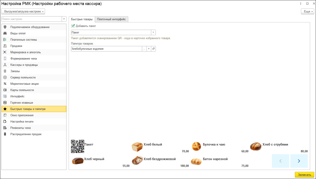 Панель «быстрых» товаров теперь имеет 2 ряда, но она больше не ограничена количеством элементов. При этом карточка пакета остается всегда видимой и первой. Если элементов больше, чем помещается на панели (было 12, сейчас 8), то вместо последней плитки появляются стрелки «Назад» и «Вперед».