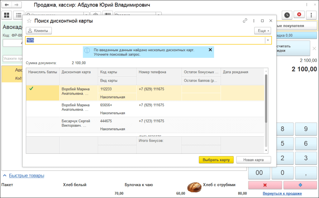 Если карт несколько или найдено несколько клиентов по введенным данным, то можно выбрать карту или создать новую.