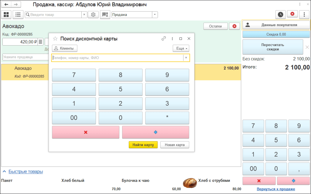 В «информационном стакане» отображается только сводная информация о покупателе. После нажатия кнопки «Данные покупателя» откроется форма для поиска карты по номеру телефона, номеру карты или ФИО клиента.