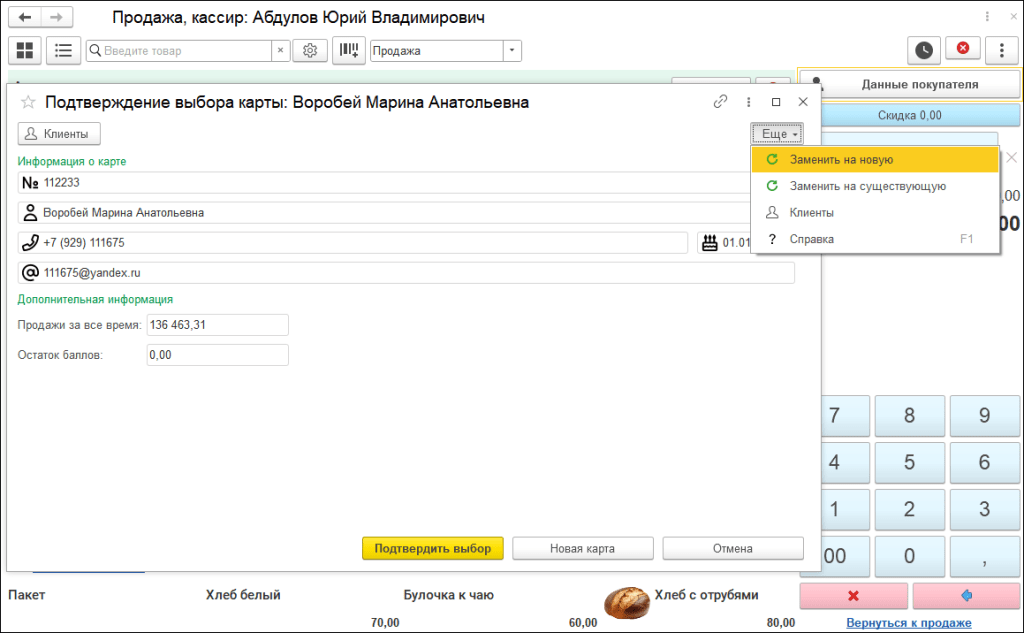 После выбора карты, данные о покупателе будут перенесены в «стакан» РМК. Для подтверждения данных и печати согласия на обработку персональных данных нужно нажать на иконку покупателя. В новом меню «Еще» доступна замена карты.