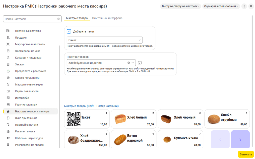 Панель «быстрых» товаров теперь имеет 2 ряда, но она больше не ограничена количеством элементов. При этом карточка пакета остается всегда видимой и первой. Если элементов больше, чем помещается на панели (было 12, сейчас 8), то вместо последней плитки появляются стрелки «Назад» и «Вперед».