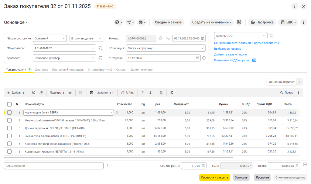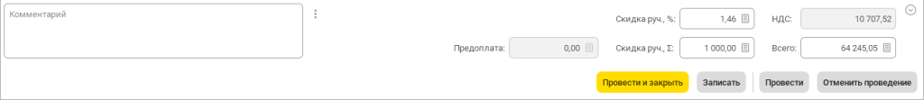 Подвал документа с итогами теперь можно развернуть и получить больше информации о итоговых суммах документа. В свернутом виде доступны только ключевые значения: сумму скидки, НДС, итоговую сумму документа.