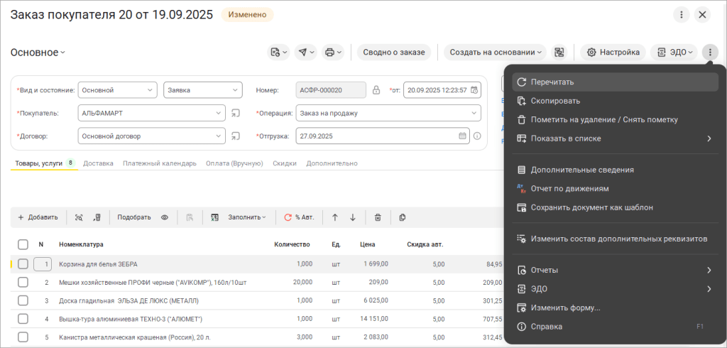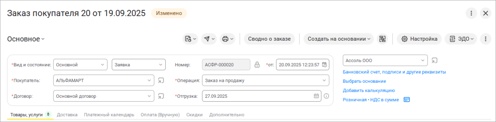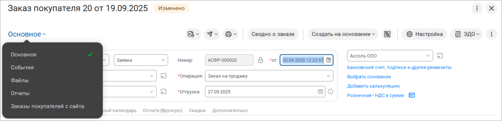 Рассмотрим на примере заказа покупателя. Закладки навигации документа теперь компактно собраны в меню «Основное». С его помощью можно быстро перейти к прикрепленным файлам и контекстным отчетам.