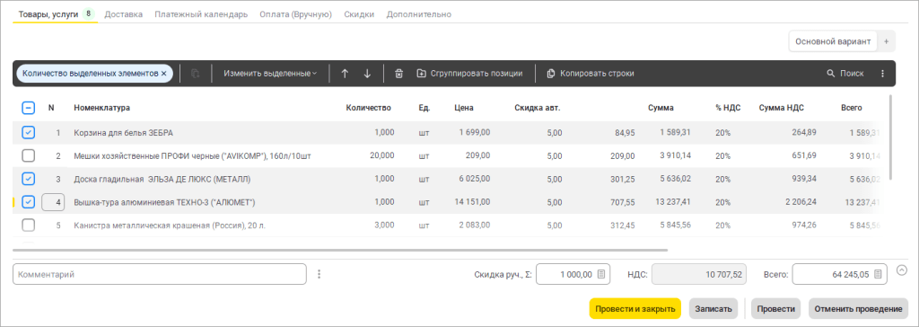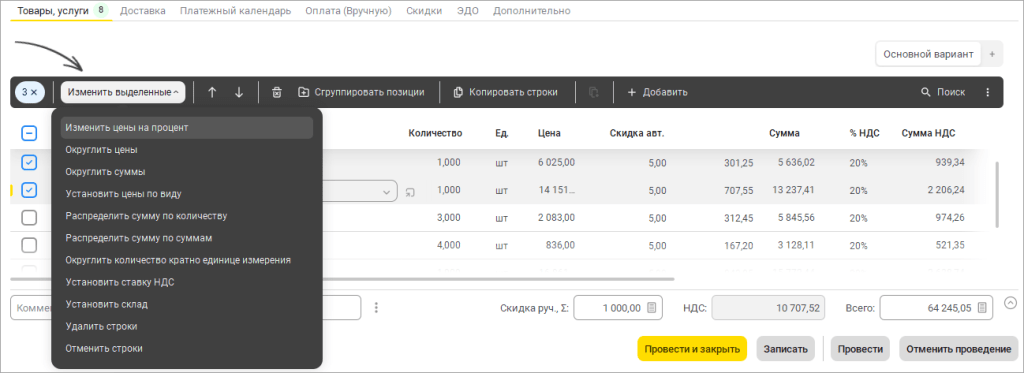 В таблицах документов можно быстро выбрать и изменить несколько строк, даже если они идут не по порядку. Для этого достаточно отметить флажками нужные строки и выбрать команду в появившемся меню.
