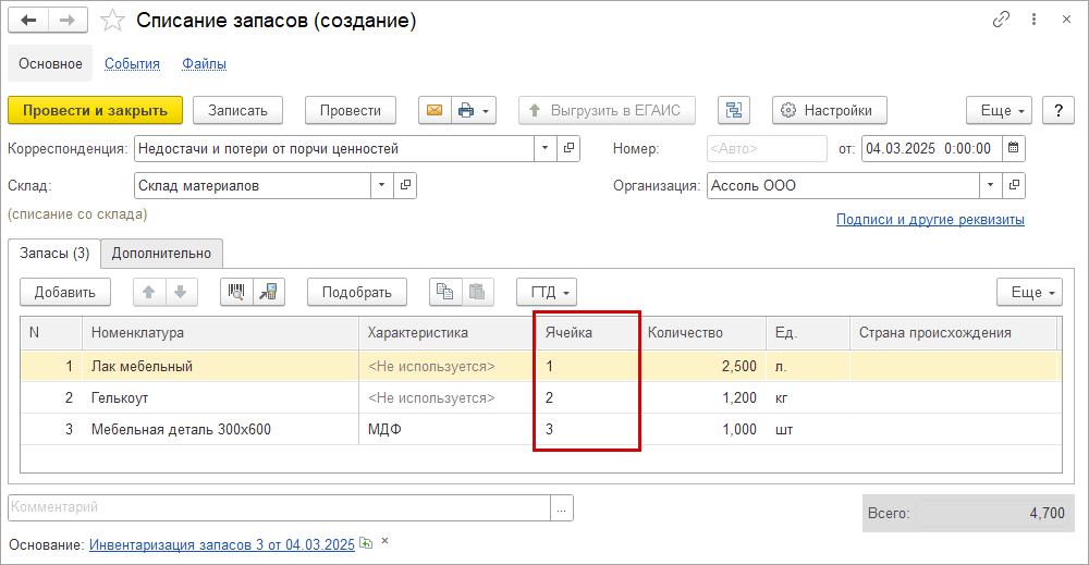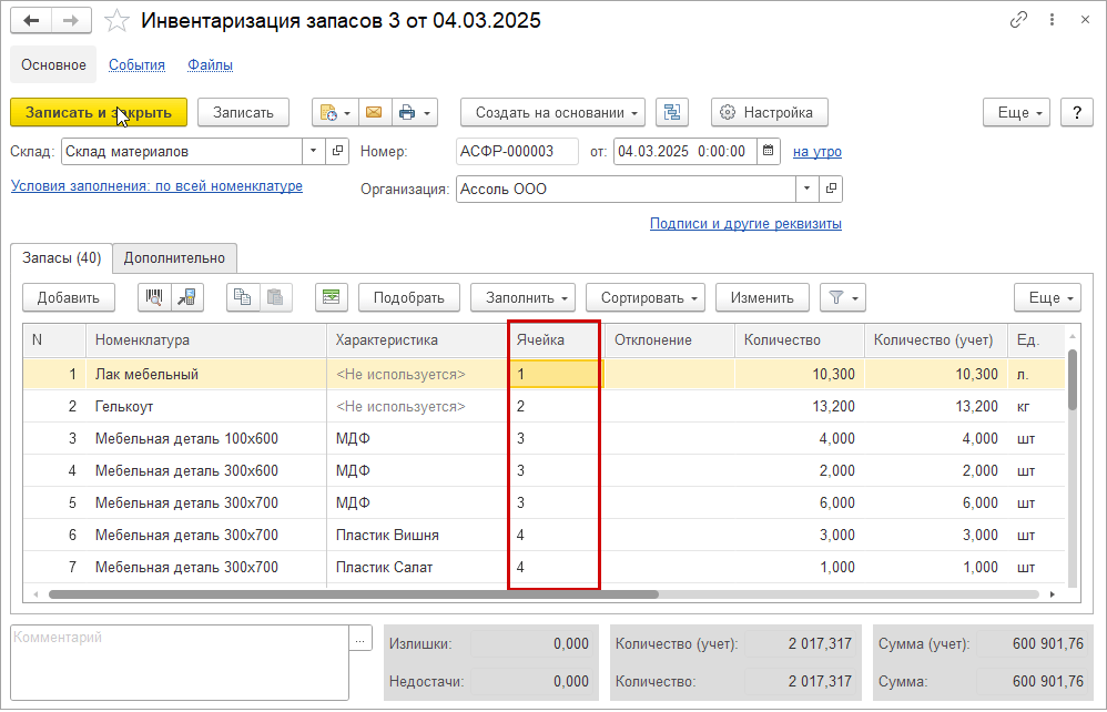 При вводе на основании инвентаризации складских актов «Оприходование запасов» и «Списание запасов», информация о ячейках будет перенесена в них автоматически.