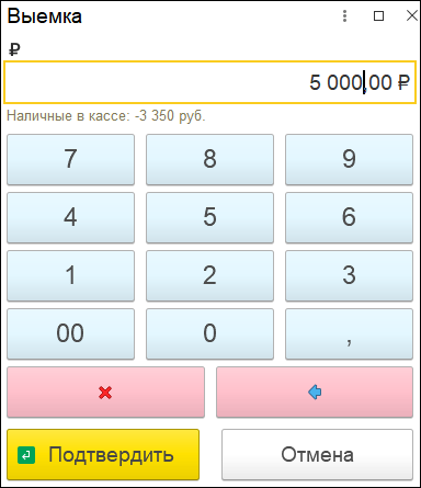 Операции выемки и внесения денежных средств выполняются через отдельные универсальные формы.