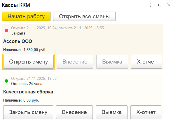 Все возможные операции с кассами собраны на отдельной форме. Перед открытием и закрытием смены всегда будет открываться окно, вне зависимости от количества подключенных касс. Здесь же можно открыть все смены нажатием одной кнопки, в том числе с помощью сочетания горячих клавиш.