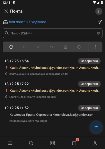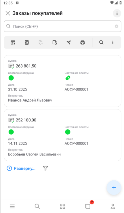 Если открыто несколько форм, на данной кнопке отобразится индикатор с количеством открытых форм. Строки списков отображаются в виде карточек, по которым быстро можно изучить основное содержимое документа без перехода.