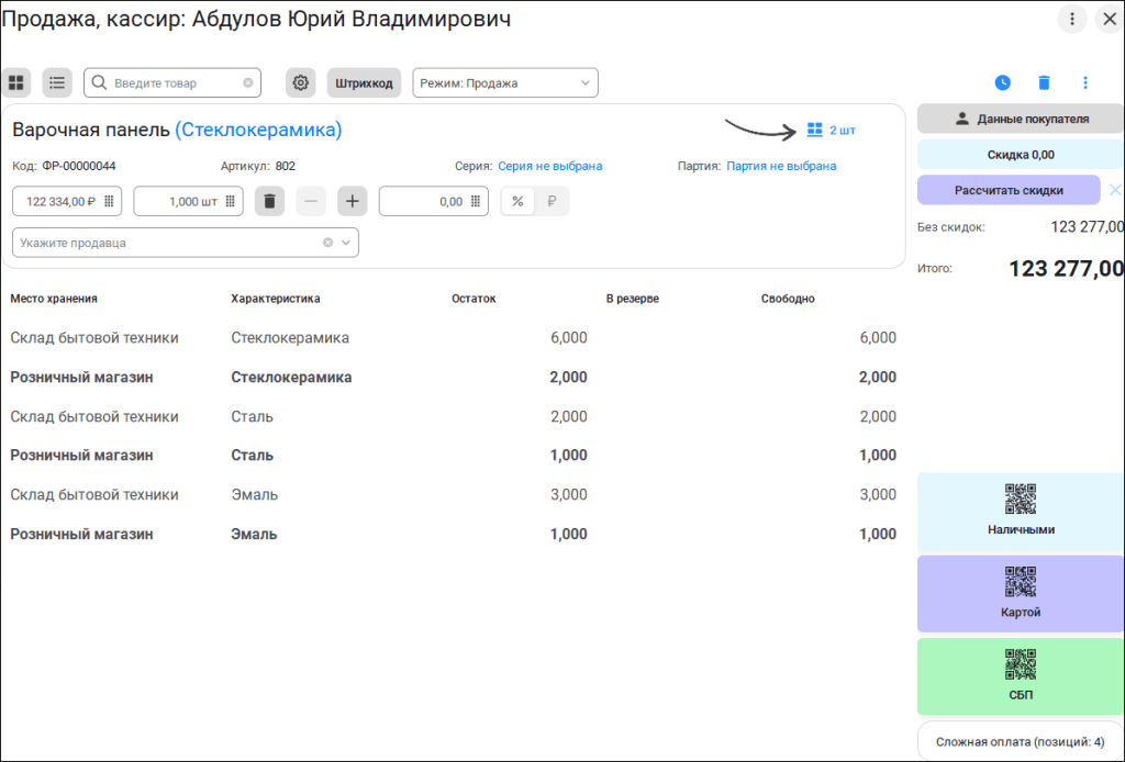 В программе «1С:Управление нашей фирмой» начиная с версии 3.0.13 значок остатка товара теперь крупнее и заметнее. Количество доступного для торгового объекта товара отображается справа от товара. На примере ниже видно, что на текущем складе доступно 2 шт. варочных панелей.