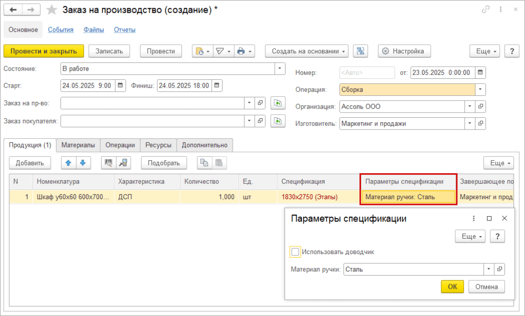 Параметры спецификации учитываются при заполнении списка материалов, необходимых для выполнения заказа на переработку.