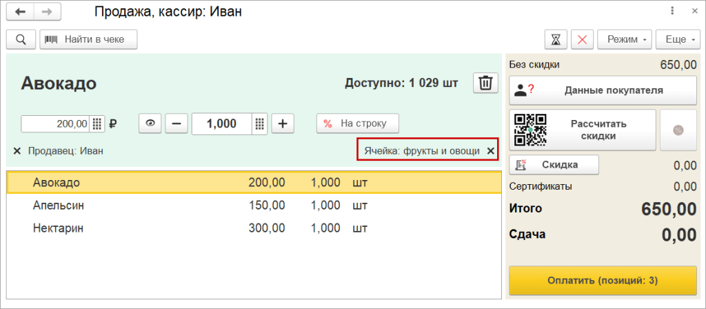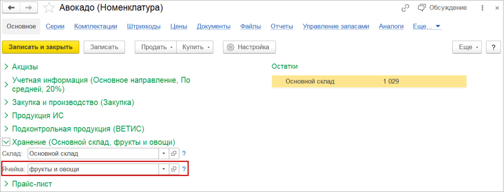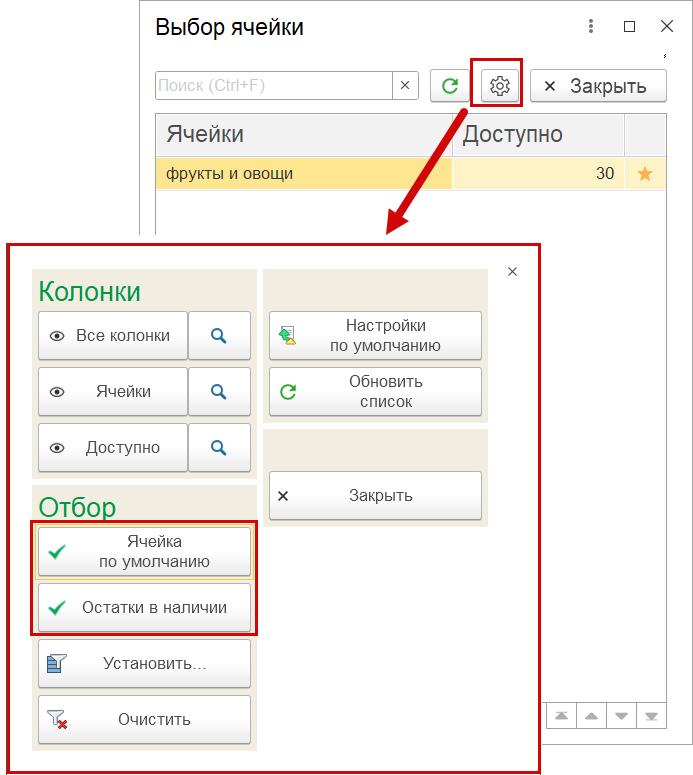 В списке выбора ячейки дополнительно отображаются: доступные остатки и признак ячейки по умолчанию. Удобно использовать быстрые фильтры: «Ячейка по умолчанию» и «Остатки в наличии».